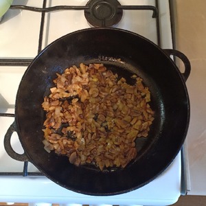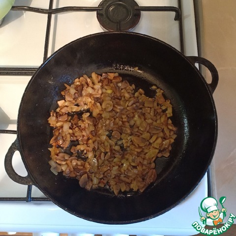 Лук и шампиньоны мелко нарезать и обжарить на сковороде с небольшим добавлением растительного масла.