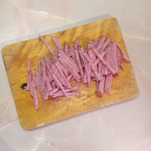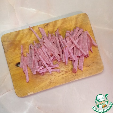 Колбасу нарезать тонкой соломкой.