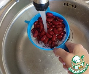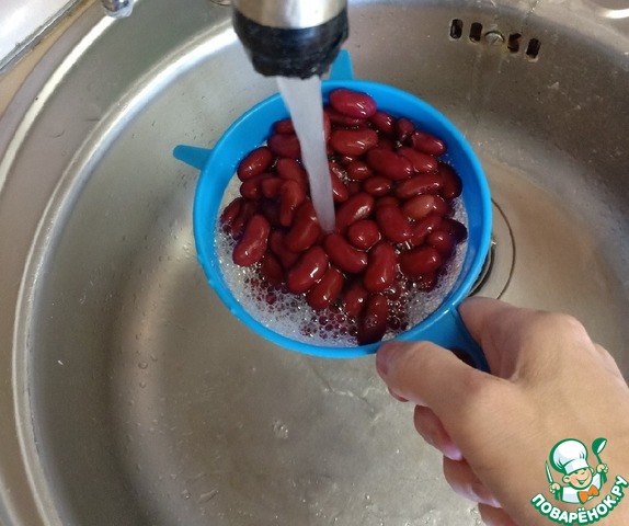 Из банки с фасолью слить жидкость и промыть ее под проточной водой. Дать воде стечь.