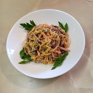 В меру остренький, с насыщенным вкусом и довольно сытный салатик. На этом сайте есть еще рецепты салата с таким же названием, но все они отличаются между собой по составу ингредиентов.