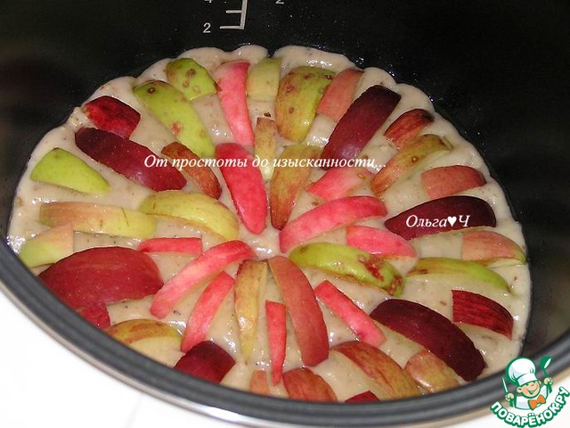 Тесто выложите в смазанную маслом чашу мультиварки. Сверху разложите яблоки, нарезанные дольками.