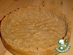 2. Дно и бока разъемной формы для выпечки смазать маслом. Плотно утрамбовать получившуюся смесь так, чтобы были закрыты дно и бока формы. Поставить в разогретую духовку и выпекать 8 мин. Дать полностью остыть, затем вынуть из формы.