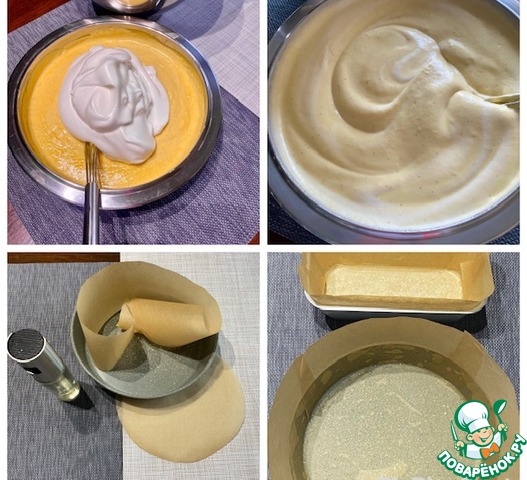 Полученную массу добавляем к большей части меренги и очень аккуратно перемешиваем силиконовой лопаткой из центра в стороны как смесь на бисквит, это позволит нам сохранить воздушность массы.