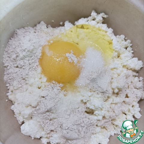 Творог рассыпчатый не ниже 9% жирности выкладываем в посуду. Добавляем 1 яйцо, 1,5 ст. л. муки (цельнозерновая или белая). Добавляем сахар и крахмал. Перемешиваем ложкой до однородности.