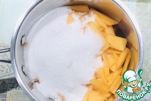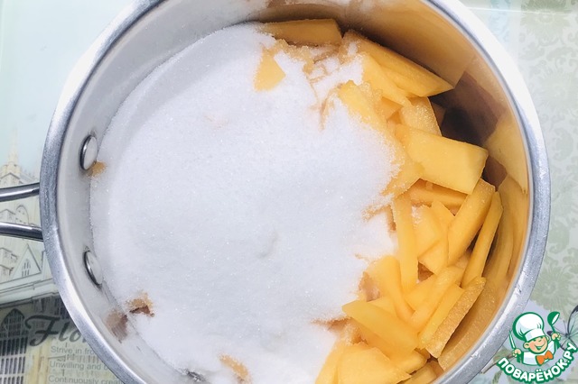 Засыпать сахаром, оставить на два часа, чтобы дыня дала сок, у меня дыня очень сочная, через 30 минут было много сока