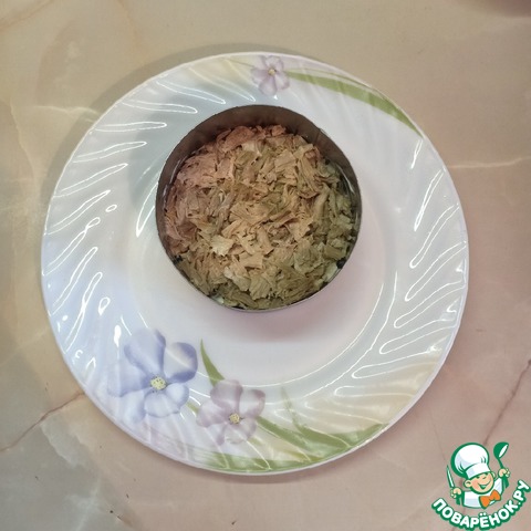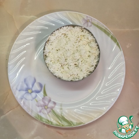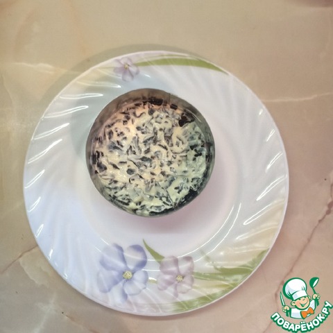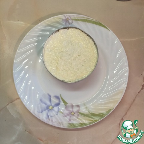 Выложить в глубокий салатник или разъемную форму, распределить равномерным слоем и сверху смазать майонезом.