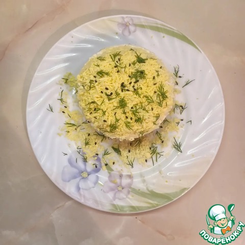 Уложить его на слой из яичного белка (можно верх слоя смазать майонезом, но я не стала, т. к. теряется воздушность и легкость сыра). Сверху на сыр натереть яичные желтки и украсить зеленью.