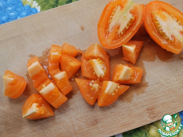 Помидоры очистить от кожицы, любым удобным способом и нарезать ломтиками.