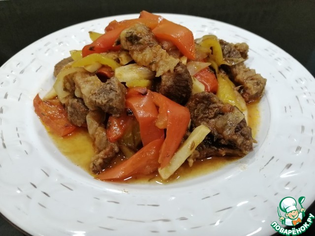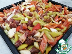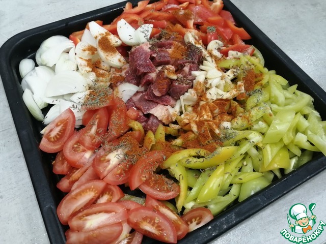 Перец, помидоры, лук нарезать так, чтобы они были примерно одинакового размера и формы с мясом.
