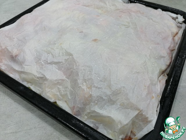 Бумагу для выпечки вырезать по форме противня, смять, смочить водой и накрыть всю нарезку. -