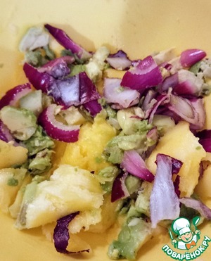 В салатнице соединить консервированный нут с манго, авокадо, красным луком.