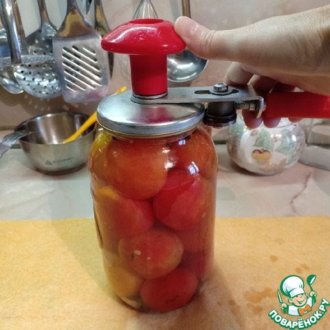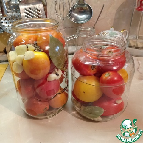 В заранее простерилизованные банки плотно уложить помидоры, чередуя их с очищенными зубчиками чеснока. Добавить лавровый лист и смесь перцев горошком.