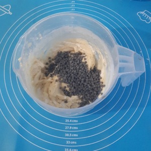 К яично-масляной массе добавить половину мучной, перемешать и всыпать шоколадные капли, перемешать.