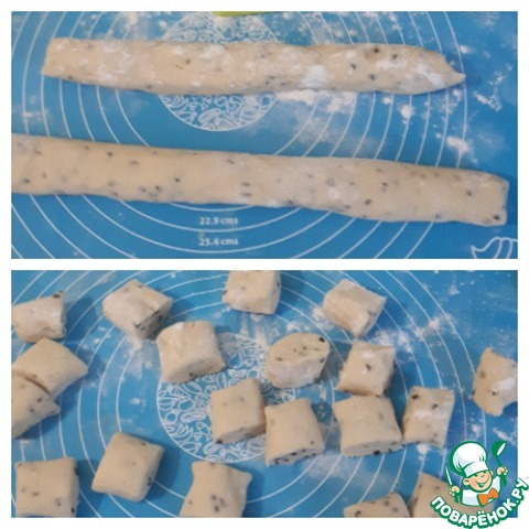 Нарежьте тесто на небольшие равные кусочки. У меня получилось 22 штуки. Вес кусочков регулируйте сами, можно сделать печенье разного размера.