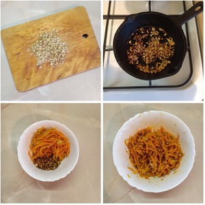 Орехи измелчить, обжарить на сухой сковороде и перемешать с морковью.