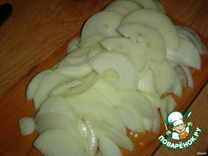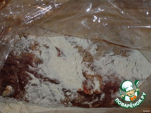 Положить его в пищевой мешок, добавить 2 ст. л. муки со специями и обвалять. Тонко нарезать лук.