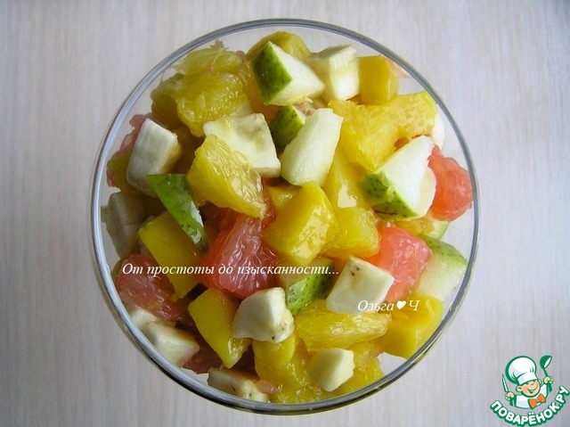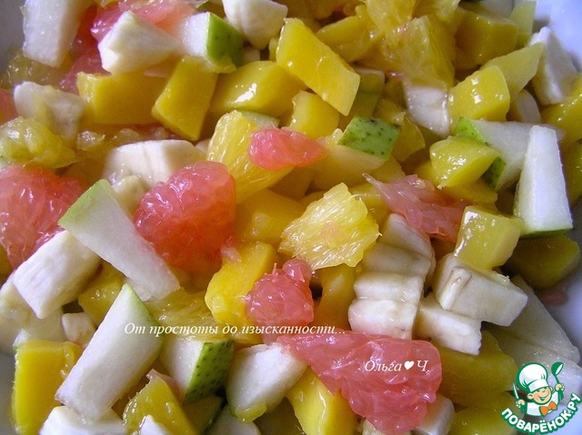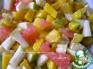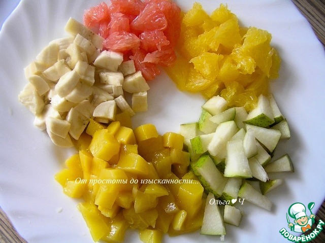 Фрукты очистите от кожуры, кроме груши. Апельсин и грейпфрут очистите от пленок. У груши вырежьте сердцевину. Нарежьте фрукты небольшими кусочками.