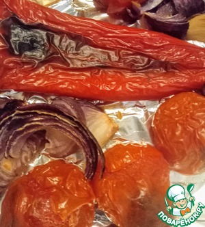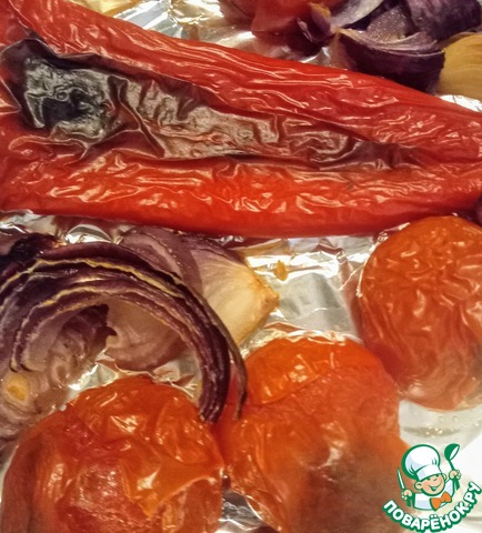Положить перцы, помидоры, чеснок и лук в форму для запекания, спрыснуть каплей оливкового масла и отправить овощи в духовку на 40 минут при 180C.