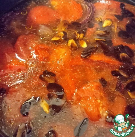 В кастрюле соединить овощи с жареным миндалём, бальзамическим соусом, оливковым маслом и водой.