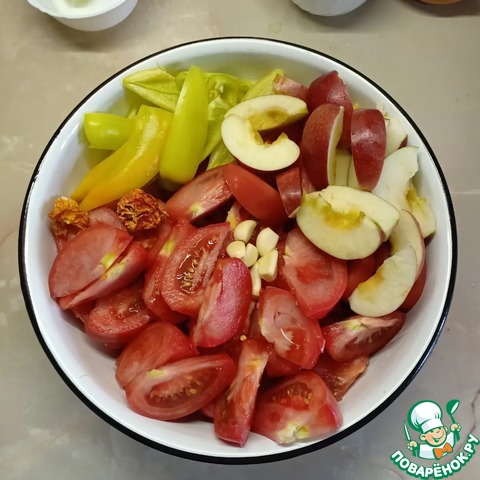 Яблоки, помидоры, острый и болгарский перец, чеснок вымыть, очистить и нарезать кусочками.