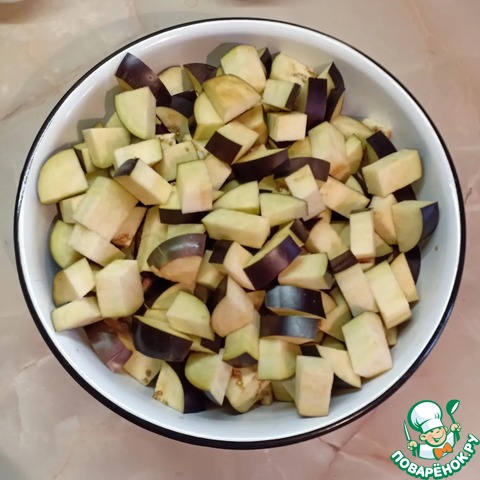 Баклажаны вымыть, срезать кончики и нарезать их средними кубиками.