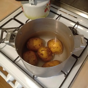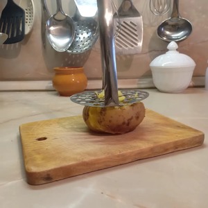 Готовый картофель вынуть из воды, и каждый клубень слегка придавить толкушкой так, чтобы он немного треснул и сплющился.