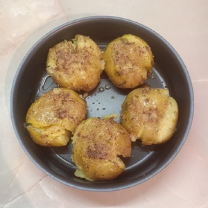 Форму для запекания смазать растительным маслом и аккуратно выложить туда расплющенный картофель. Сверху картофель смазать ароматной смесью.