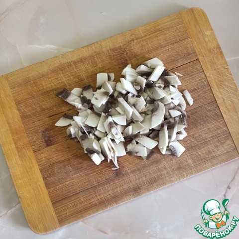 Шампиньоны почистить и нарезать средними кубиками. Если грибы крупные, то их необходимо нарезать кубиками, а если мелкие, то лучше пластинками, так они будут гораздо красивее смотреться в салате.