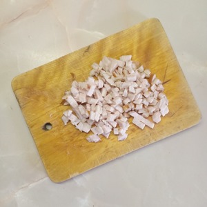 Копченую грудку нарезать мелкими кубиками.