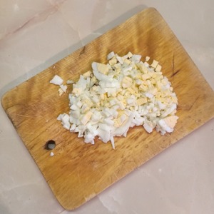 Яйца нарезать мелкими кубиками. Часть желтков можно оставить для украшения салата.