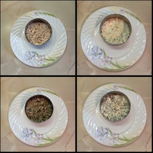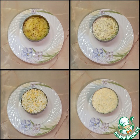 Выложить салат слоями в глубокую салатницу, промазывая каждый слой майонезом: