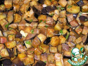 Обжарьте лук на растительном масле, добавьте баклажаны, нарезанные кубиками, обжарьте до мягкости, снимите с огня.