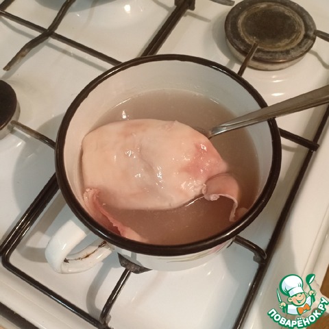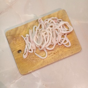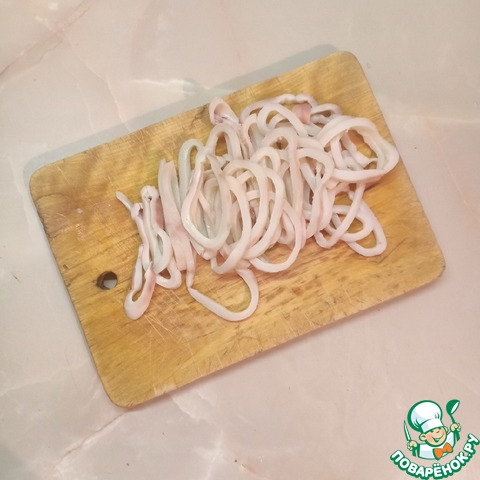 Кальмары очистить от пленки и отварить в слегка подсоленной воде.