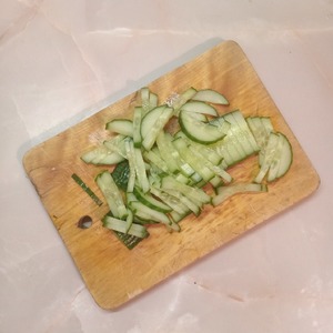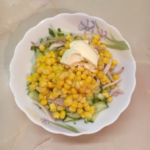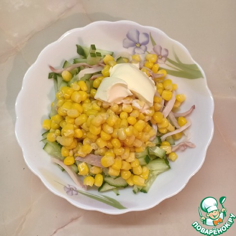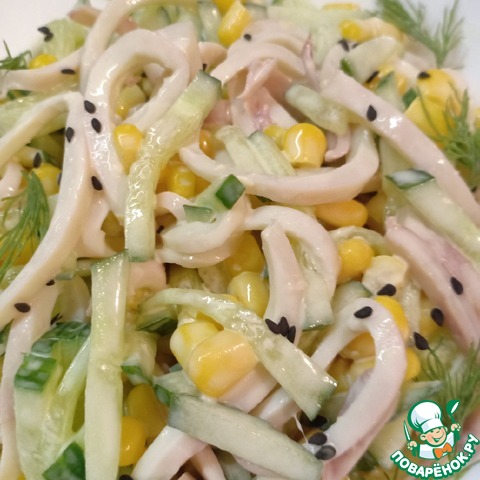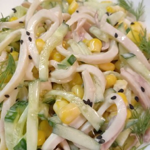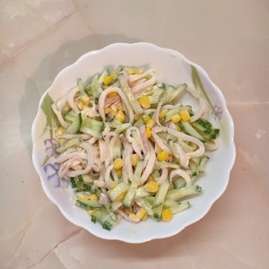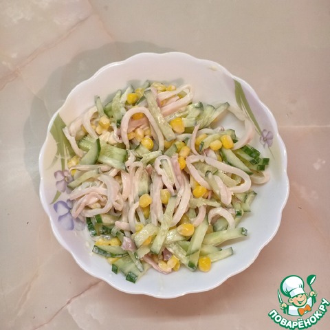 В глубокой миске соединить кольца кальмаров, огурцы и кукурузу. Посолить по вкусу и заправить майонезом.