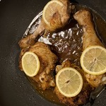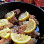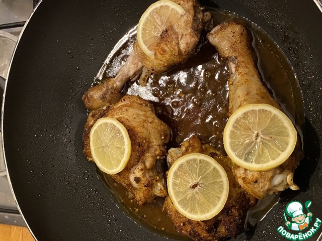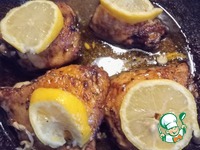 В сковороду к соусу добавить куриные бедра. Перемешать и на каждое бедро выложить по ломтику лимона. Тушить на медленном огне под крышкой 10 минут. Приятного аппетита. |