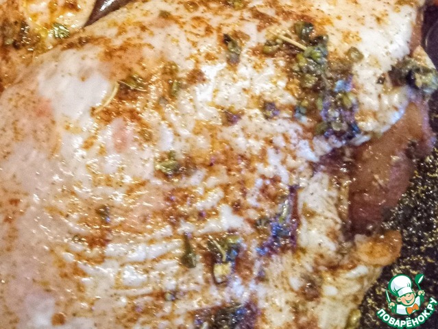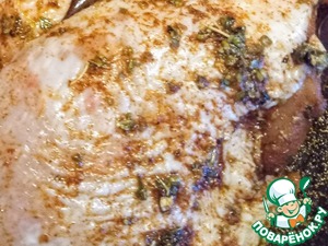 Обвалять куриные бедра в орегано, тимьяне, копчёной паприке и чесночном порошке. Посолить, поперчить. |