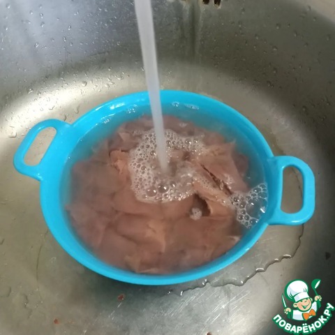 Промыть печень под проточной водой.