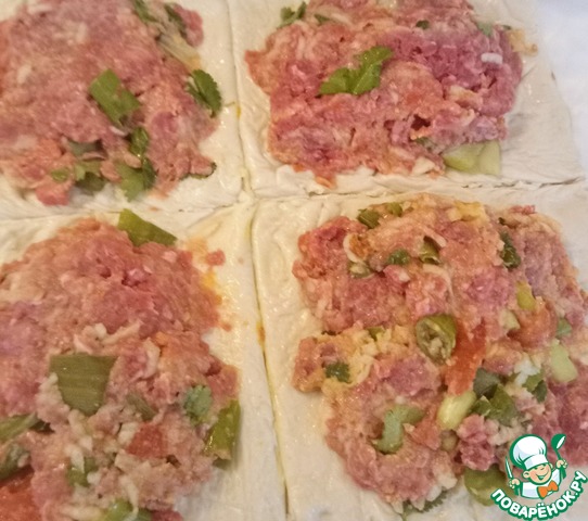 Раскатать тесто и нарезать его на прямоугольники приблизительно 12 см х 6 см. Выложить их в форму для запекания, и в середину каждого кусочка добавить по 3 столовой ложки смеси. Утрамбовать с помощью обратной стороны ложки. Отправить в духовку на 40 минут при 180 C.