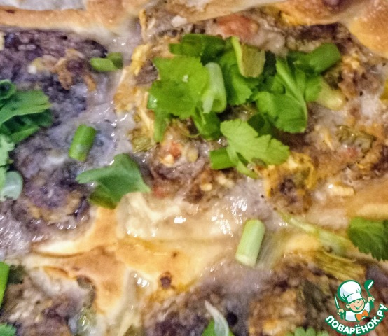 Вынуть слойки из духовки. Украсить мелко нарезанной кинзой и луком. Приятного аппетита