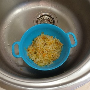 Квашеную капусту хорошо промыть под проточной водой и дать воде стечь.