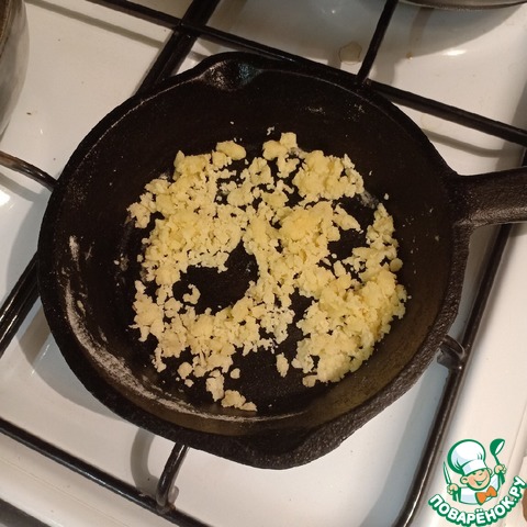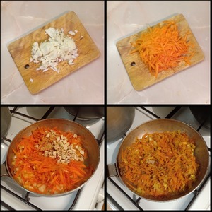 Очистить лук и морковь. Лук мелко нарезать, морковь натереть на терке, корень петрушки мелко покрошить. Обжарить овощи до готовности в небольшом количестве сливочного масла.