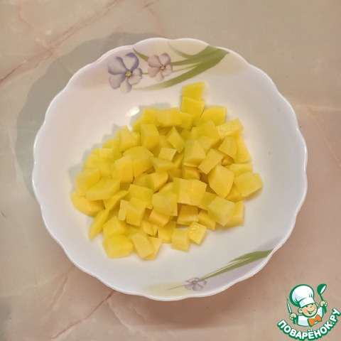 Картофель очистить и нарезать средними кубиками.