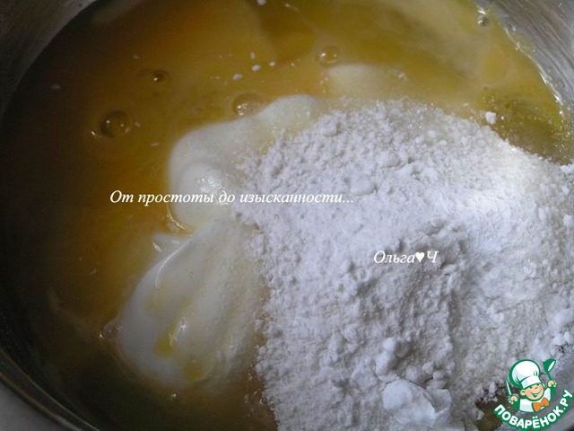 А пока приготовьте заливку. Соедините сметану, сахар, яйцо, белок и ванилин.