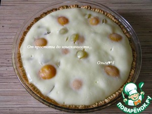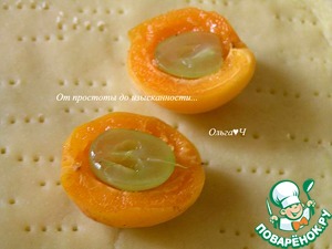 Выложите абрикосы с виноградом на основание из теста, перевернув виноградом вниз, добавьте оставшийся виноград.