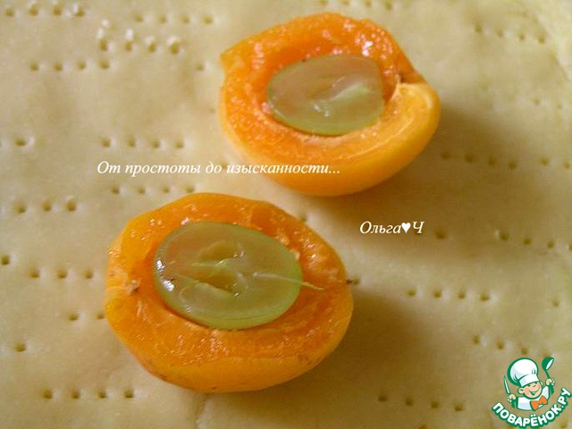 Подготовьте фрукты. Из абрикосов выньте косточки, разделив на 2 половинки. Виноград разрежьте пополам. В половинки абрикосов положите по половинке винограда.