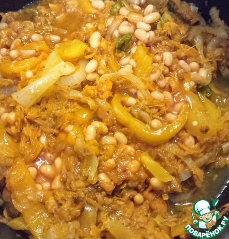 В конце приготовления в кастрюлю добавить варёную фасоль и воду. Варить финальные две минуты. Затем убрать с плиты.
