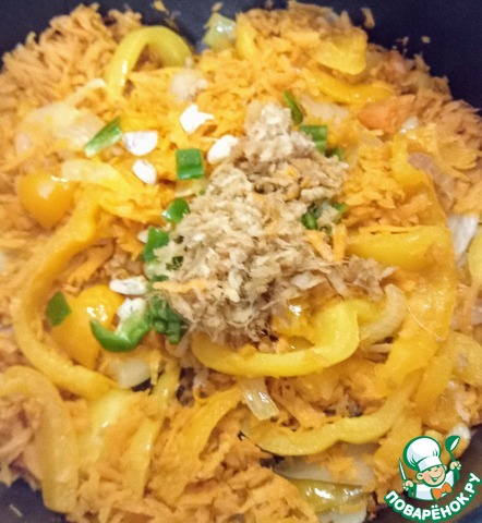 Добавить натёртую морковь и жарить ещё 5 минут. Затем, уменьшить огонь до среднего и соединить в кастрюле чеснок, имбирь и жгучий зелёный перец. Варить 2 минуты