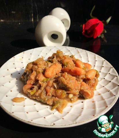 Уже в сваренное лобио (жидкость должна покрывать бобы) кладем измельчённые орехи, чеснок, чабер(кондари). Кладем перец, резанную зелень кинзы, уксус и солим