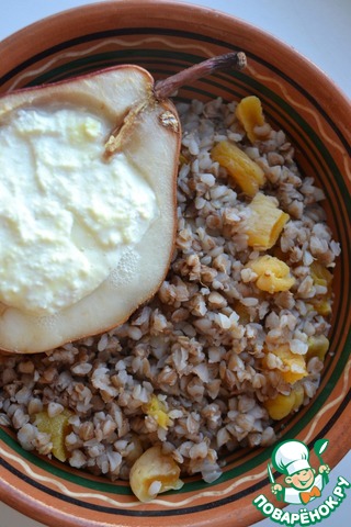 Смешать курагу и готовую гречневую кашу. Сверху выложить половинку груши.