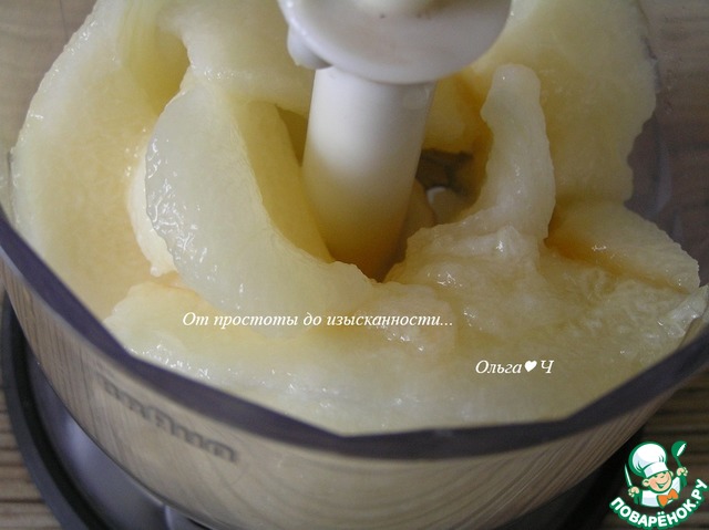 Приготовьте дынный бисквит. Мякоть дыни поместите в чашу блендера.